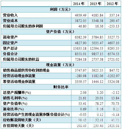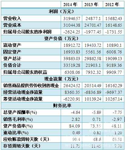 2013年開始公司實(shí)現(xiàn)穩(wěn)定的產(chǎn)品銷售,2014年由于銷售規(guī)模的增加營(yíng)業(yè)收入和營(yíng)業(yè)成本穩(wěn)定增長(zhǎng)。從公司資產(chǎn)結(jié)構(gòu)來看,公司資產(chǎn)負(fù)債率53.41%,保持在行業(yè)合理區(qū)間,2014年流動(dòng)資產(chǎn)中隨著商品銷售力度加大,存貨大幅減少,貨幣資金及應(yīng)收款項(xiàng)大幅增長(zhǎng)。