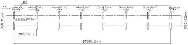 第一次調(diào)整:①安裝好水平架,通過水平架上的左右、上下螺桿、螺母及水平管來調(diào)整4條細(xì)鋼絲,保證鋼絲對應(yīng)跑輪的最高點,離跑輪的距離控制在50mm以內(nèi)(圖示一)。②粗調(diào)時,由于沒有緊固地腳螺絲,穩(wěn)定性差、受力太大時易移位,不利調(diào)整,故盡可能用千斤頂,不宜用大錘。粗調(diào)精度控制在1mm以內(nèi)。③調(diào)整完后,將底座用鋼筋與基礎(chǔ)鋼筋焊接,焊接時注意對角焊,以防焊接變形;螺栓自然垂直,用鋼筋點焊固定(注意:焊接電流不易過大,以防燒傷螺桿造成緊固斷裂),套好螺母;⑤聯(lián)結(jié)好各軸間的聯(lián)軸器;⑥清理干凈基礎(chǔ)內(nèi)的泥、臟物,進行第一次灌漿(一定要用振動棒搗實)。灌漿層離座底150-200mm,利于千斤頂有位置調(diào)整,混凝土強度達(dá)要求后,進行第二次調(diào)整。