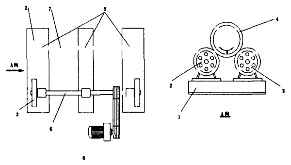 一、半圓形水泥管成型機(jī)的研制 1.1 生產(chǎn)工藝原理 與普通離心水泥制品成型的不同點(diǎn)就是在離心過程中增加了振動(dòng)環(huán)節(jié)。按照約定,產(chǎn)品必須滿足一定的抗?jié)B要求,而普通離心工藝無法滿足該水泥管混凝土的密實(shí)度要求。因此,研制時(shí)在離心過程中增加了振動(dòng)工序,對正在高速旋轉(zhuǎn)的水泥管模具及模具內(nèi)混凝土施加高頻振動(dòng),使混合料中的碎石、砂、水泥和水得到一定的合理分布,提高混凝土的密實(shí)度。振動(dòng)裝置是在水泥制管機(jī)一側(cè)安裝四個(gè)帶有刻槽的油壓振動(dòng)輪,分布于水泥管的兩端和中間部位,在液壓油缸的推動(dòng)下與水泥管模具跑輪接觸產(chǎn)生振動(dòng)力,實(shí)現(xiàn)離心振動(dòng)。同時(shí)振動(dòng)時(shí)四個(gè)振動(dòng)輪可同時(shí)開啟也可分別振動(dòng),在分料時(shí)隨著布料進(jìn)度而分別開啟相應(yīng)位置的振動(dòng)輪,中速振動(dòng)時(shí),可全部開啟振動(dòng);并可根據(jù)管徑的大小,采取不同的振動(dòng)時(shí)間。振動(dòng)時(shí)間通過操作控制臺(tái)來實(shí)施控制。 1.2 半圓形水泥管成型機(jī)的主要設(shè)備 半圓形預(yù)應(yīng)力水泥管成型機(jī)包括以下幾個(gè)部分:①高頻振動(dòng)離心機(jī);②水泥管模具;③鋼筋加工設(shè)備;④混凝土攪拌站;⑤混凝土布料機(jī);⑥蒸汽養(yǎng)護(hù)系統(tǒng)。 1.2.1 離心系統(tǒng) 離心系統(tǒng)包括離心電機(jī)、托輪及托架兩個(gè)部分。離心機(jī)采用的支承方法為托輪式,依靠磨擦力帶動(dòng)模具跑輪旋轉(zhuǎn)。振動(dòng)系統(tǒng)包括托架、液壓油缸、振動(dòng)輪幾個(gè)部分(附圖)。 ![]() 附圖 雙托輪式離心機(jī)組型式 1、底座;2、被動(dòng)托輪;3、主動(dòng)托輪;4、鋼模板;5、軸承座;6、主動(dòng)軸;7、被動(dòng)軸;8、調(diào)速電機(jī); 1.2.2 離心振動(dòng)工藝中的離心速度 在振動(dòng)離心成型中,所要控制的工藝技術(shù)參數(shù)主要是離心速度與離心時(shí)間的問題。包括低速振動(dòng)布料、中速振動(dòng)成型和高速離心密實(shí)排漿3個(gè)工序。對應(yīng)的離心速度分為低速、中速、高速,3個(gè)階段應(yīng)計(jì)算出相應(yīng)的轉(zhuǎn)速和控制時(shí)間。 低速布料時(shí),水泥管模具轉(zhuǎn)動(dòng)速度控制在120r/min左右,對應(yīng)的電機(jī)轉(zhuǎn)速為150r/min。布料時(shí)間隨水泥管型號(hào)不同所需混凝土量而變化,一般控制在5~20min。采用低速布料是易于觀察縱向及四周方向布料的均勻程度,達(dá)到初步成型的目的。 中速離心成型與振動(dòng)時(shí)的水泥管模具轉(zhuǎn)速一般控制在250~350r/min,不同型號(hào)的水泥管通過控制模具的線速度來實(shí)現(xiàn)混凝土相應(yīng)的離心力和振動(dòng)力。此階段的時(shí)間控制在1~4min。采用振動(dòng)布料方法,可加快布料速度,同時(shí)解決布料不均勻的缺陷。 高速離心轉(zhuǎn)速一般控制在520r/min,對應(yīng)的電機(jī)轉(zhuǎn)速為650r/min。此階段的時(shí)間為5~15min。高速離心的目的是為了達(dá)到密實(shí)、排漿,析出多余流離水和增加內(nèi)壁光潔度的目的。 研制完成后的振動(dòng)離心機(jī)主要技術(shù)參數(shù)見表1。