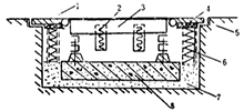 2. 隔振措施 振動員噪聲除了通過空氣傳播外,也能通過墻和基礎(chǔ)傳播,我們采用二次隔振措施:1. 振動臺框架與底座基礎(chǔ)間采用中等硬度橡膠作隔振器;2. 底座基礎(chǔ)與坑底地面采用“浮隔”法處理(見圖2)。 ![]() 圖2 混合隔振系統(tǒng)示意圖 1. 振動臺框架;2. 隔振材料;3. 附加重量(活動基礎(chǔ)塊);4. 松散緩沖隔離層(砂+木屑);